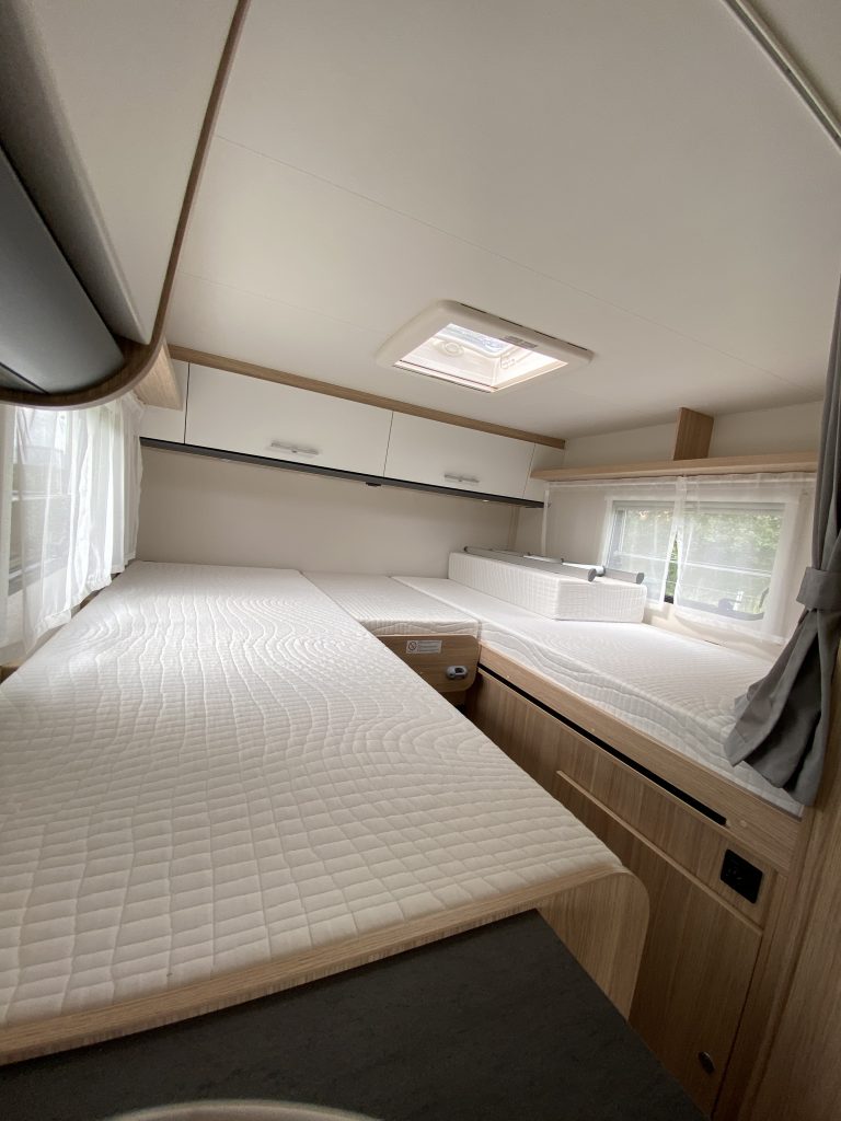 Im Inneren warten unter anderem großzügige Längsbetten mit hochwertigen Matratzen, die mit einer Liegefläche von zwei mal zwei Metern jede Menge Platz zum Kuscheln und Erholen bieten. Ein weiterer kleiner Schlafplatz lässt sich bei Bedarf für eine dritte Person einrichten. Außerdem sind ein Badezimmer mit Dusche, eine Küche und jede Menge Stauraum für das notwendige Equipment vorhanden. Unterhalten kann Piccolina Herrchen und Frauchen mit einem Radio und einer automatischen Sat-Anlage, zu der ein 22-Zoll-LED-TV gehört. Diese putzige Begleiterin hält zudem Besteck, Geschirr, Töpfe, Pfannen, einen Campingtisch, Stühle, eine Markise, Fahrradträger und LED-Beleuchtung bereit.